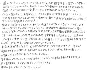 対応に関してもとてもすばらしく、こちらの都合で何回も相談させてもらってご迷惑をおかけしてしまったのにも関わらず、最初~最後まで親身になって対応して下さって、とても感謝をしております。